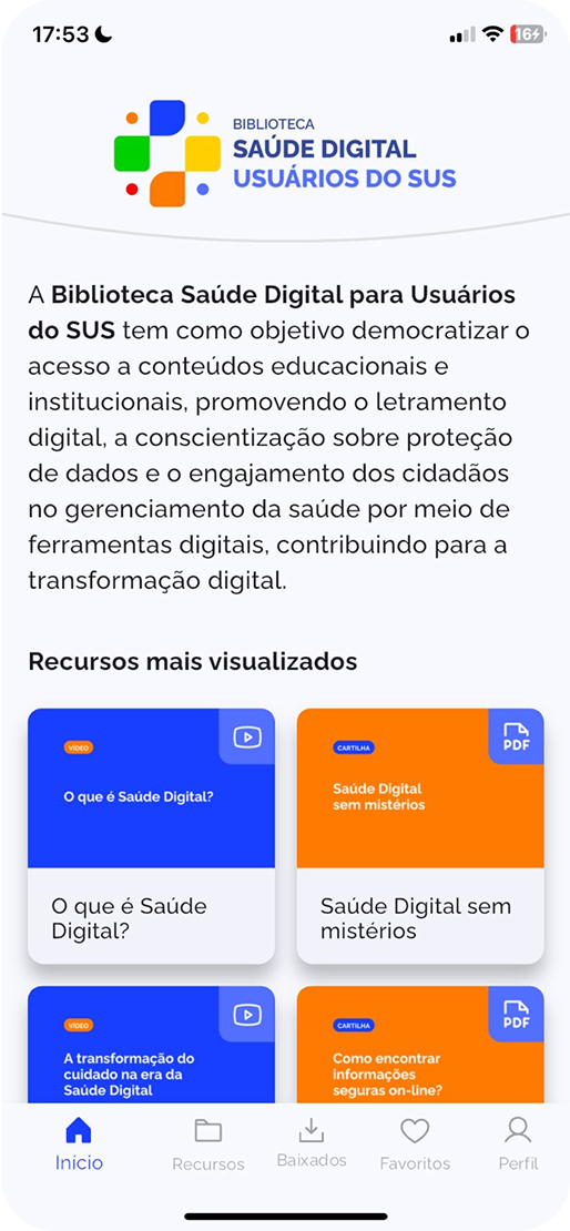 A Biblioteca Saúde Digital para profissionais do SUS 1 foi desenvolvida especialmente para apoiar profissionais da saúde que atuam no SUS. Ela reúne conteúdos especializados sobre saúde e tecnologia, com foco nos desafios, inovações e boas práticas da transformação digital no Sistema Único de Saúde.